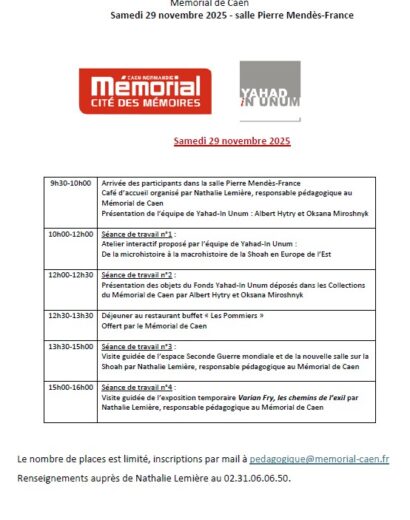 Tarif : gratuit / sur réservation : pedagogique@memorial-caen.fr / 02.31.06.06.50 ( capacité 20 places) – Le repas est offert par le Mémorial de Caen