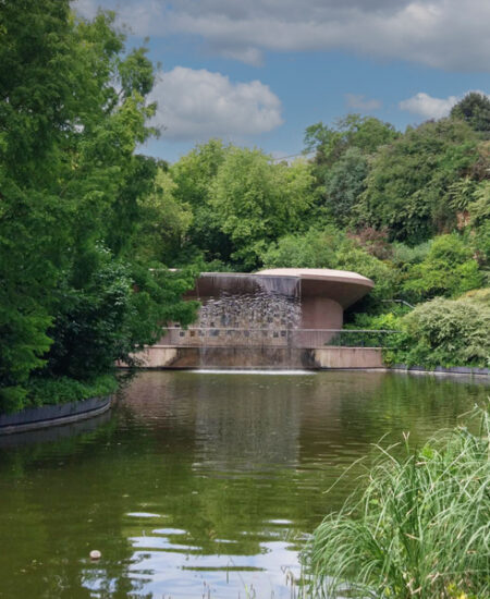 Il s’organise autour d’une cascade, symbole de vie, à proximité de laquelle sont présentées les plaques des cinquante États Américains.