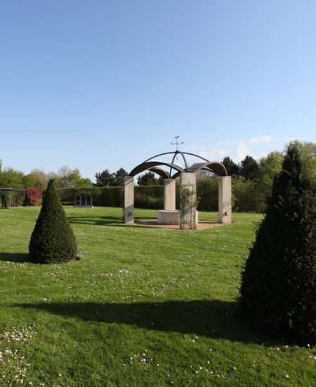 La pergola de l’entrée, en forme de croix celtique, rappelle l’engagement des Régiments Irlandais. Le Temple des esprits, monument central du Jardin, rend hommage à ceux qui ont perdu la vie. Par une arche de conifères, on accède au lieu de méditation : le Jardin de la Paix.