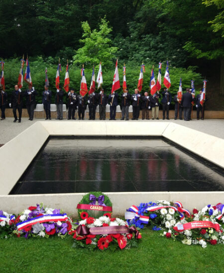 Conçu par douze étudiants en architecture des universités de Montréal et Ottawa, le jardin canadien est un lieu empreint de recueillement. Sur le muret figurent les noms des 122 communes normandes libérées par des soldats canadiens. Les paroles de Virgile sont gravées dans la plaque de granit noir au centre du monument : « Nulla dies umquam memori vos eximet aevo » (jamais le temps ne vous effacera de la mémoire des âges).